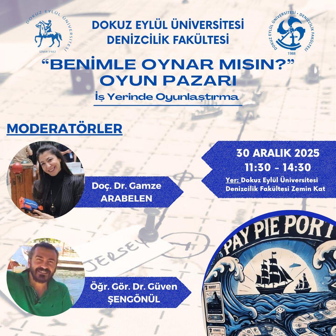 Dokuz Eylül Üniversitesi Denizcilik Fakültesi Denizcilik İşletmeleri Yönetimi Bölümü öğretim üyeleri Doç.Dr. Gamze ARABELEN ve Öğr.Gör.Dr. Güven ŞENGÖNÜL moderatörlüğünde geleneksel olarak düzenlenen "Lojistik Oyun Pazarı" etkinliğine BANÜ-DTLM temsilen Müdür Dr.Öğr.Üyesi Ersin Fırat AKGÜL katılmıştır.