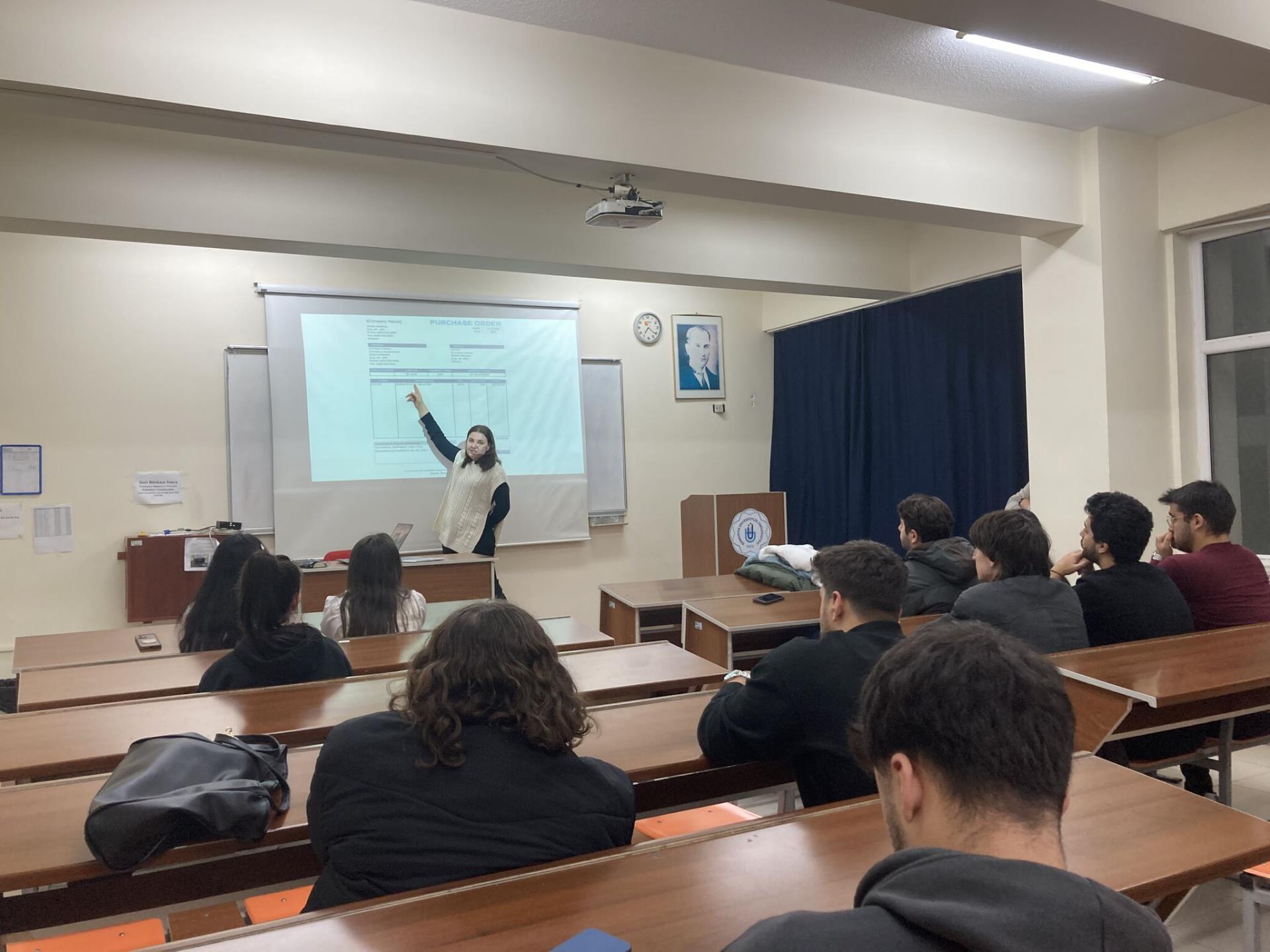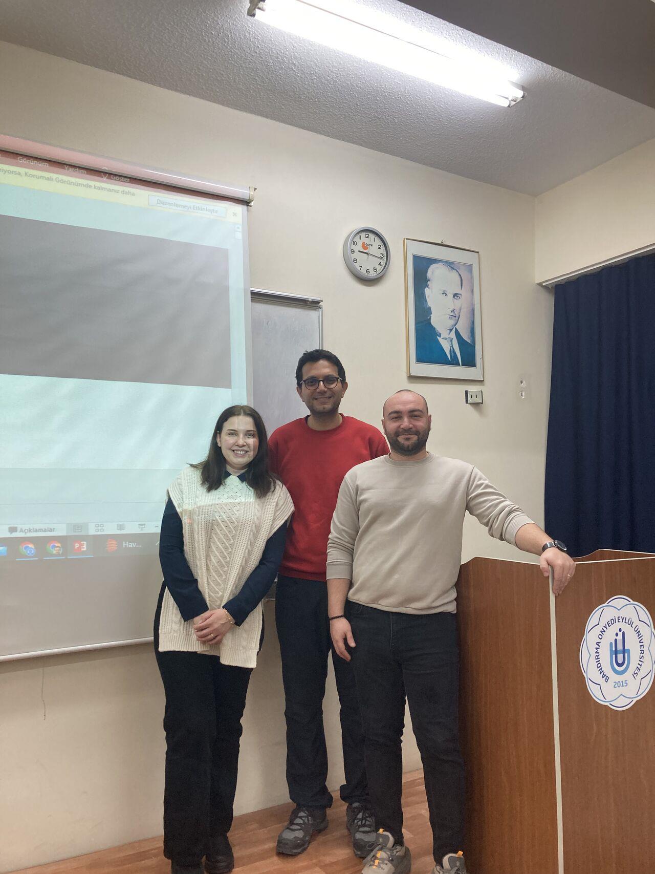 Kocaman Balıkçılık Dış Ticaret Sorumlusu Sena Bağcı Tanış ve Kühne Nagel Deniz Lojistiği Müşteri Yöneticisi Mert Tanış, BANÜ-DTLM Müdürü Dr.Öğr.Üyesi Ersin Fırat AKGÜL'ün davetlisi olarak ithalat ve ihracat operasyon süreçleri üzerine bir eğitim gerçekleştirdiler. Mezunu oldukları üniversitemize bu kez konuşmacı olarak gelmenin gururunu yaşadıklarını belirtilen konuşmacılar ile oturum sonunda hatıra fotoğrafı çekildi.